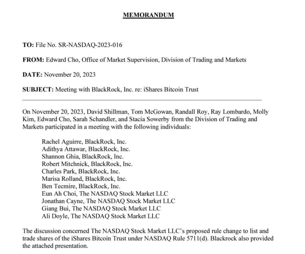 BlackRock 和 Nasdaq 的代表与美国证券交易委员会 (SEC) 讨论了允许上市比特币现货交易所交易基金 (ETF) 的提议规则。