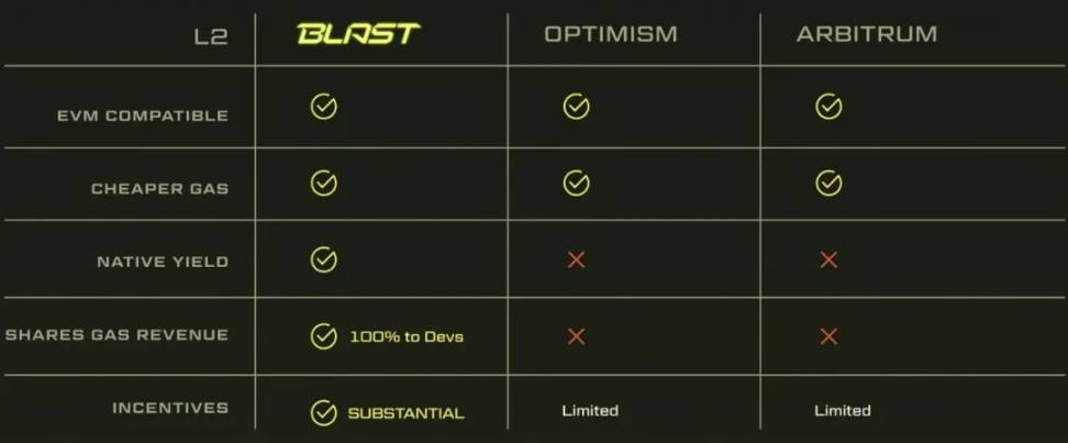 Blast 主打提供原生收益,是首个提供 ETH 和稳定币原生收益的以太坊二层网络,与一般二层解决方案中资产通常不产生收益的情况形成显著差异。Blast 的收益来自以太坊质押和 RWA 协议。这些去中心化协议的收益会自动返还给 Blast 用户,协议包括 Lido 和 MakerDAO,自动将收益回流给用户。