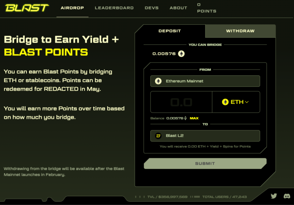 - 将资产从以太坊主网桥接至 Blast,以获得质押收益和积分。这些存入的代币将锁定至 2024 年 2 月。用户在 7 天内桥接任何金额可获得双倍积分。