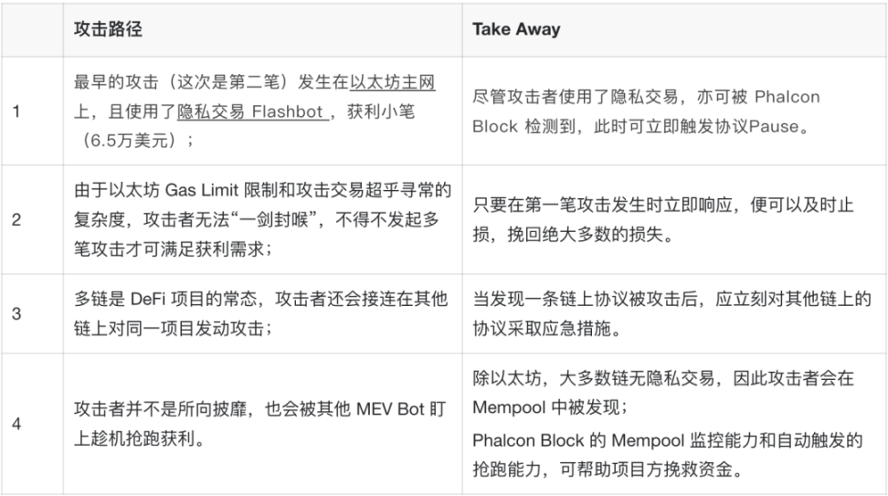 如果使用了 Phalcon Block,那么在系统监测到第一笔攻击时,便可立刻自动化触发协议 Pause 或其他预设的挽救措施,项目方亦可将其他链上的协议一并立即 Pause。将损失控制在(第一笔的)86 万美元,而不是现如今的 4600 万美元。