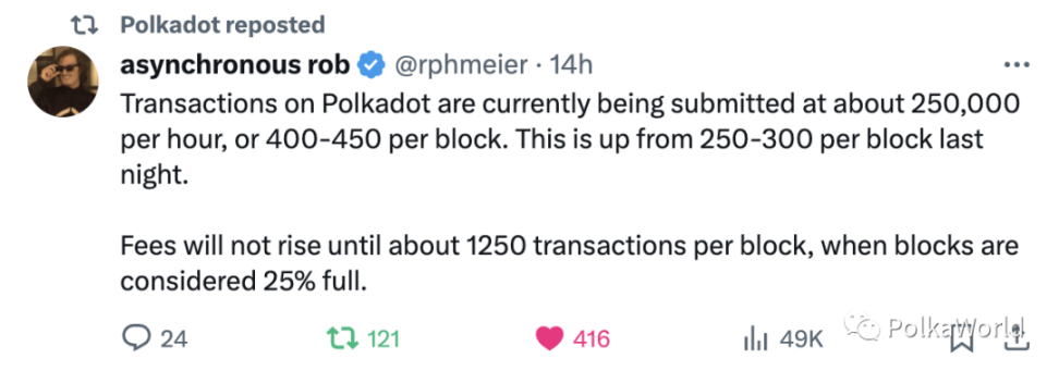 此外,Web3 基金会的教育与治理倡议负责人 Bill 也发推表示,“ 我刚刚进行了一次转账,六秒钟内就包含在一个区块里,费用为 0.015 DOT。” https://twitter.com/BillLaboon/status/1737866043345797195