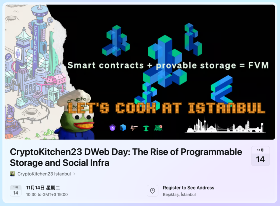 来自 Protocol Labs、Filecoin、Ceramic、DataverseOS、Atticc、Zerion 和其他等生态项目的联合创始人、架构师、研究员、投资人将来到加密厨房,通过土耳其美食工作坊、土耳其咖啡圆桌等一系列活动围绕可编程存储及数据 DAO、去中心化身份、去中心化社交、去中心化数据库等下一代万维网的课题开展轻松且深入的分享交流。