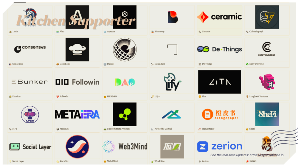 支持者:1inch、Aleo、Aspecta、Biconomy、Ceramic、Cointelegraph、Consensys、Cookbook、Daoist、Delendum、De Things、Early Universe、EBunker、Flowin、HERDAO、Lify+、Lita、Longhash Ventures、M7e 元宇宙特攻队、Meta Era、Network State Protocol、NewTribe Capital、Orangepaper 橙皮书、SheFi、Social Layer、Starknet、Web3Mind、掀风 Wind Rise、Zerion、亚非拉 Web3 研究院
