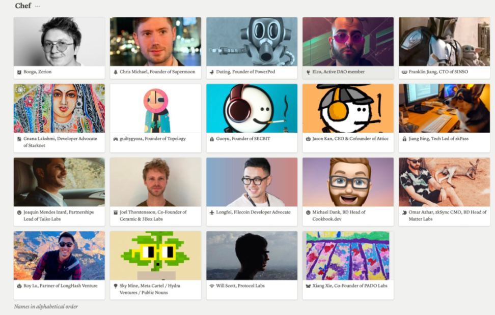 时至今日,加密厨房这一全球首创的舌尖上的 Crypto 盛筵邀请到了 Filecoin、Atticc、zkPass、Taiko、PowerPod、斯坦福 BASS、Protocol Labs、Ceramic、Cookbook、Longhash Ventures、Topology、安比实验室、zkSync、Starknet、Zerion、Supermoon、PADO Labs、SINSO、Meta Cartel 等来自不同生态、项目、机构的思想领袖、先锋项目创始人担任不同活动的「主厨」(后续仍在增加……)