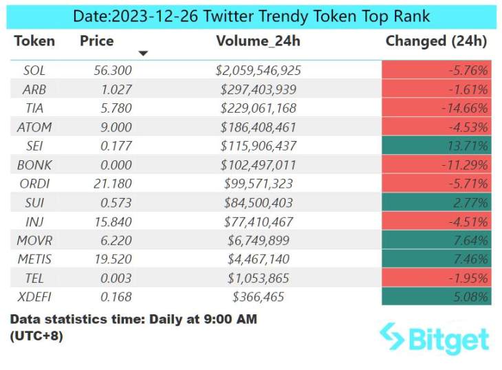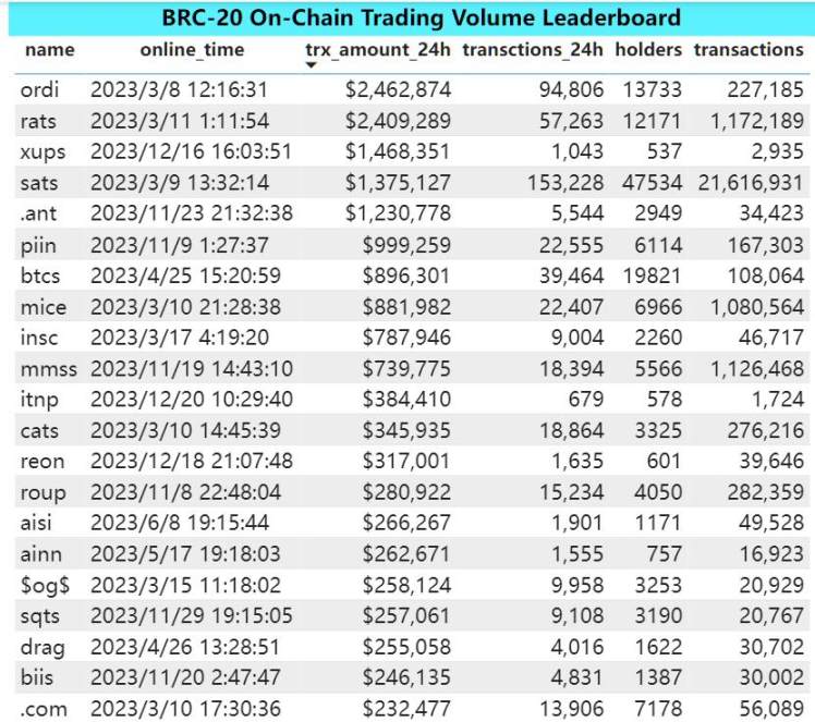 BRC20 Tokens:ORDI 过去 24h 交易放量 3 倍,24h 交易量达到 $1.7B,ORDI 币价短时突破 82 美金创新高后回落,Insightnews 的推文指出币安钱包将在 1 月 4 日上线铭文板块,但随后遭到币安官方人员否认。 ORDI 的大涨带动了整体 BRC20 市场的回暖反弹。