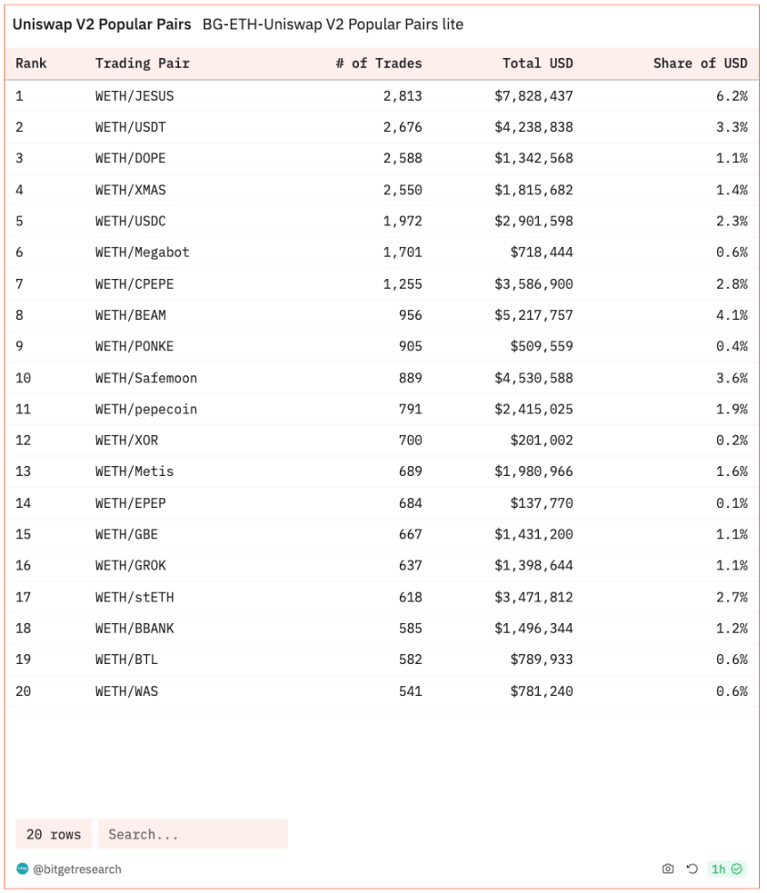 JESUS(Token):交易热度持续高涨的 ETH 上 meme coin,链上持币地址数 = 13.26K,链上流动性池子 liquidity = $2.54M,过去 24h 链上交易量达到 $8M 以上。