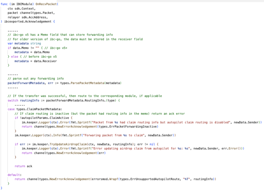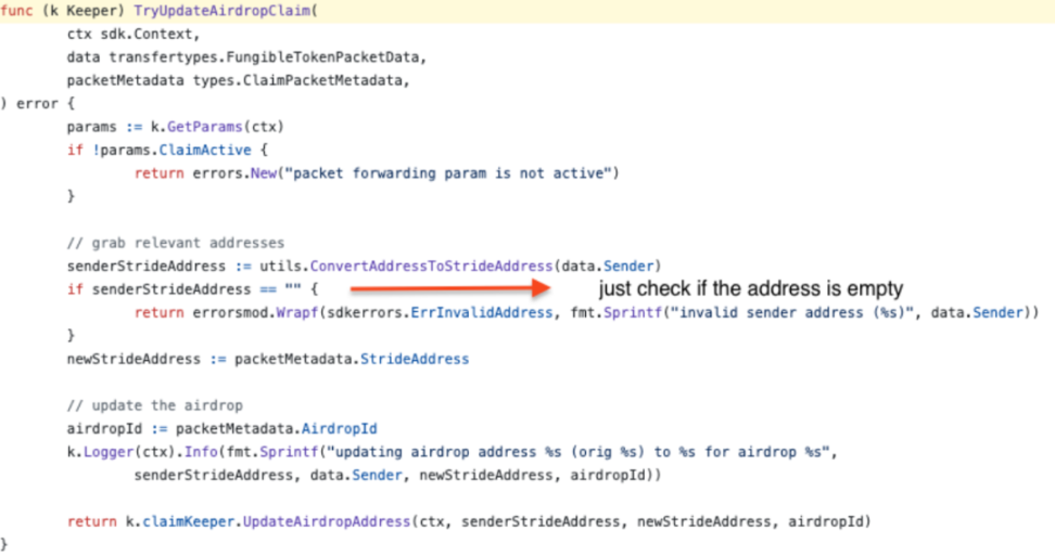 漏洞位置:https://github.com/Stride-Labs/stride/blob/3a5c7bfcc3b8c5e7dd870f01bebeb9d949492203/x/autopilot/module_ibc.go#L119