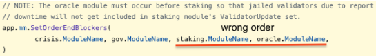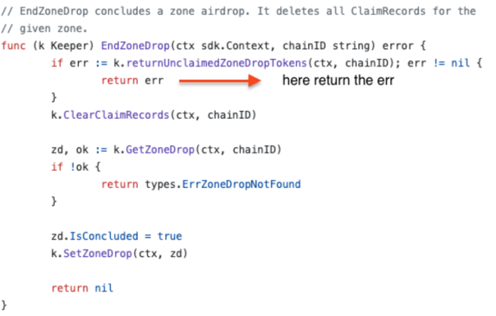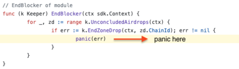 漏洞背景:BeginBlocker 和 EndBlocker 是模块开发人员可以在其模块中实现的可选方法。它们分别在每个区块的开始和结束时触发。在 BeginBlock 和 EndBlock 方法中使用崩溃来处理错误可能会导致链在出现错误时停止。EndBlocker 清算未完成的空投时未考虑模块是否有足够的代币从而触发崩溃的可能,导致链停止运行。