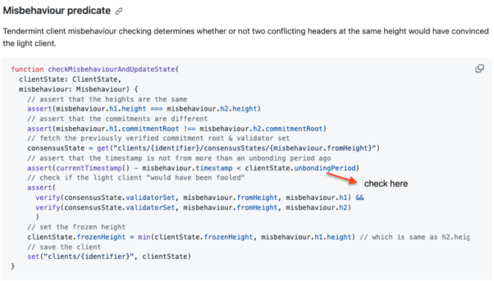 漏洞位置:https://github.com/cosmos/ibc/tree/e01da1d1346e578297148c9833ee4412e1b2f254/spec/ics-007-tendermint-client#misbehaviour-predicate