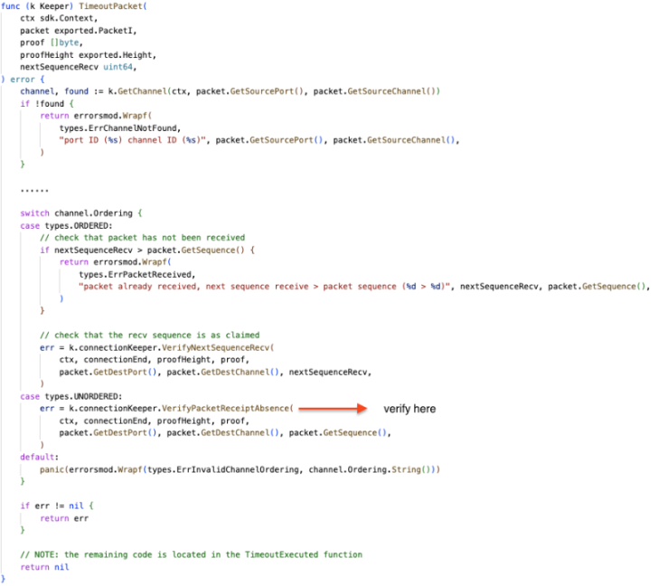 漏洞位置:https://github.com/cosmos/ibc-go/blob/00a680cda52690a4ba835bf37f53acc41c01bc7a/modules/core/04-channel/keeper/timeout.go#L117C28-L117C54