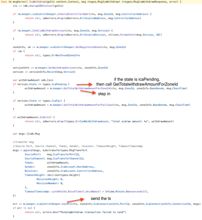缺少状态更新。在 IcaWithdraw() 方法中,如果交易失败,版本状态没有修改,会导致 WithdrawRecord 无法访问,对应的资金也无法提取。更通俗的理解就是 state 设置在 SendTx 前,失败后未修改 state,导致该资金回撤失败并且下次无法再次回撤。