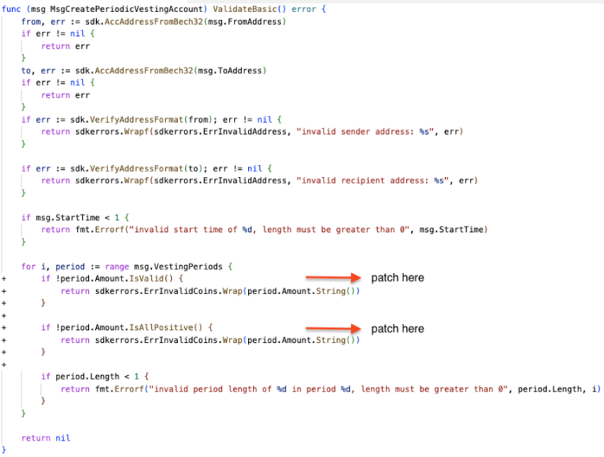 漏洞背景:MsgCreatePeriodicVestingAccount.ValidateBasic 验证机制缺失对账户的存活等状态的判断。在 x/auth 中定义的 PeriodicVestingAccount,攻击者可以将受害者的账户初始化为恶意归属账户,该账户允许存款但不允许取款。当用户将资金存入其账户时,这些资金将被永久锁定,并且用户无法提取。