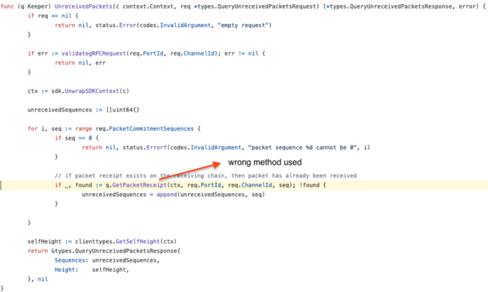 漏洞位置:https://github.com/cosmos/ibc-go/blob/11297aaa61e651c16e6d4147a15be24ce55ba7cc/modules/core/04-channel/keeper/grpc_query.go#L408
