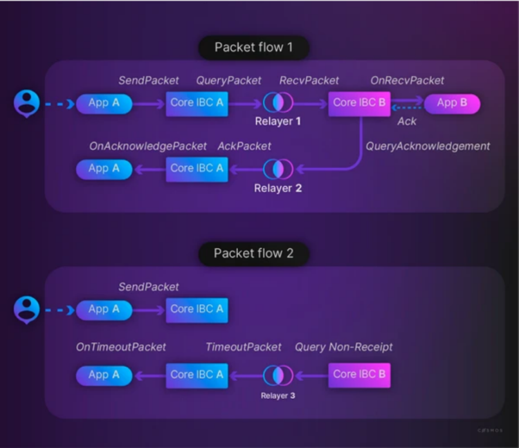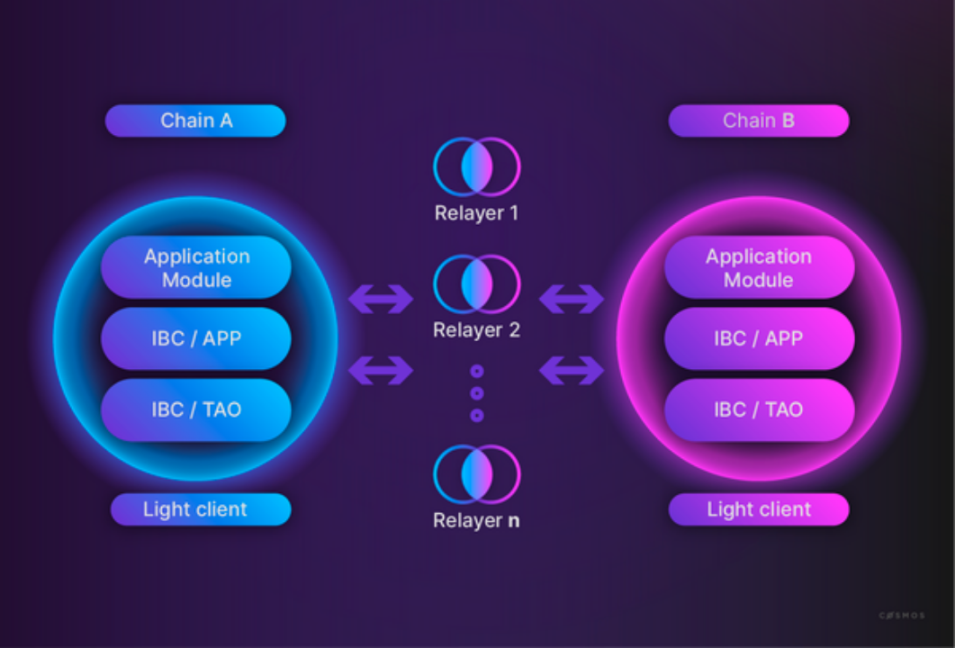 IBC 协议的基础是轻客户端(light clients)和中继器(relayers)。通过 IBC 进行通信的链 A 和链 B 互相具有对方账本的轻客户端。链 A 无需信任第三方,只需通过验证区块头就可以对链 B 的状态达成共识。通过 IBC(尤其是模块)进行交互的链彼此间不会直接传送消息。相反,链 A 将数据包中的一些消息同步至其状态。随后,中继器会对这些数据包进行检测,并将它们传送给目标链。