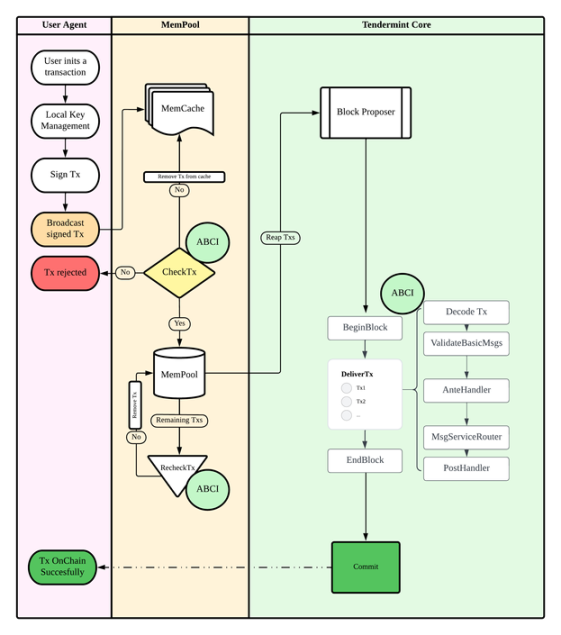在 Cosmos 生态里,交易最初在用户代理中被创建,然后会被签名并广播到区块链内的节点。节点利用 CheckTx 方法来验证各种交易细节,如签名、发件人的余额、交易序列和提供的燃料等。如果交易通过验证,它将被添加到内存池,等待被包含在一个区块中。另外,如果交易未通过验证,将向用户发送错误消息,导致交易被拒绝。在区块执行期间,会对交易进行进一步检查,这是通过 DeliverTx 方法完成的,以确保一致性和确定性。