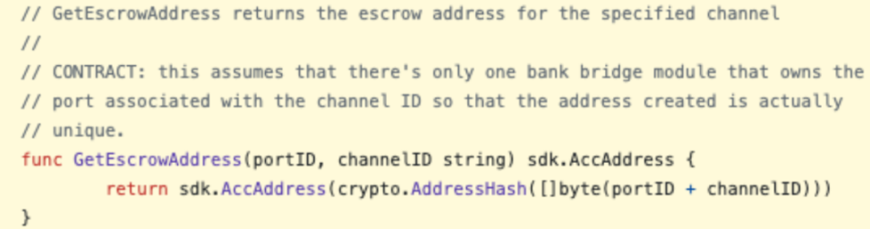 漏洞背景:托管地址冲突。GetEscrowAddress() 是截断为 20 字节的 SHA256(端口 ID+ 通道 ID)。这种方法存在三个问题: