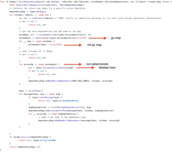 除了验证类型,在 sdk.Msg 的处理逻辑中,也会遇到如涉及到大量 gas 消耗的循环操作,不合理的崩溃处理等,由于针对消息的处理链上具备相应的 recovery 机制,因此它们的危险程度相对于链停止运行会低一些,但依然可以影响到系统的正常运行或是导致链上资金的损失。