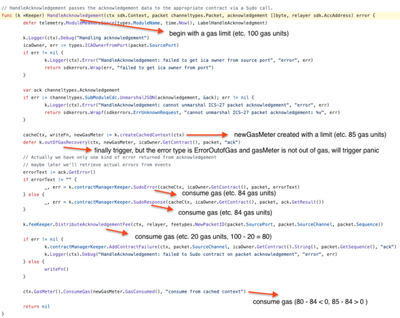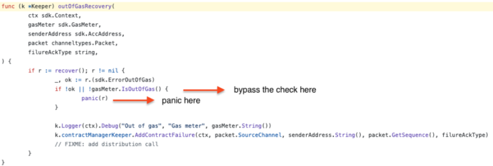 漏洞背景:智能合约为 IBC 事件的确认 / 超时支付的费用没有得到足够的验证,恶意智能合约可以利用这一点在 OnAcknowledgementPacket 和 OnTimeoutPacket 消息处理期间导致 ErrorOutOfGas 崩溃。这些崩溃不会通过 outOfGasRecovery 执行来恢复,这意味着交易不会包含在区块中,并且会导致 IBC 中继器重复提交消息,最终可能会造成中继器资金流失和网络废弃数据包过多的危害。