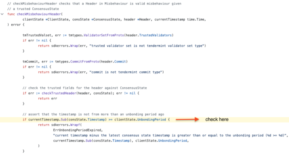 根据 Tendermint 安全模型来看,时间为 t 的区块(标头)的 NextValidators 中的验证器需要在 t+TrustingPeriod 之前正确运行,在那之后,它们可能会有其他行为。然而这里检查的是 UnbondingPeriod,而不是 TrustingPeriod,其中 UnbondingPeriod>TrustingPeriod。如果 consState 的期限介于 TrustingPeriod 和 UnbondingPeriod 之间,那么将接受该标头作为用于验证构成不当行为的其中一个冲突标头的基准。在此期间,consState.NextValidators 中的验证器不再被认为是值得信任的,敌对的前验证者可以在不冒任何风险的情况下关闭客户端。