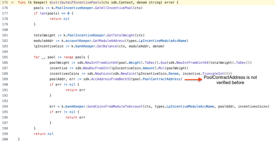漏洞背景:铸币分发操作中缺乏地址验证,从而导致操作失败,资金流失。在铸币模块中,每次 token 铸造都取决于抵押金额。然而,如果池不存在或者合约地址输入错误,铸币模块可能会发生意外情况,导致区块链停止运行。在奖励池模块中,池合约地址没有经过验证。如果分发操作失败,链将直接停止运行。