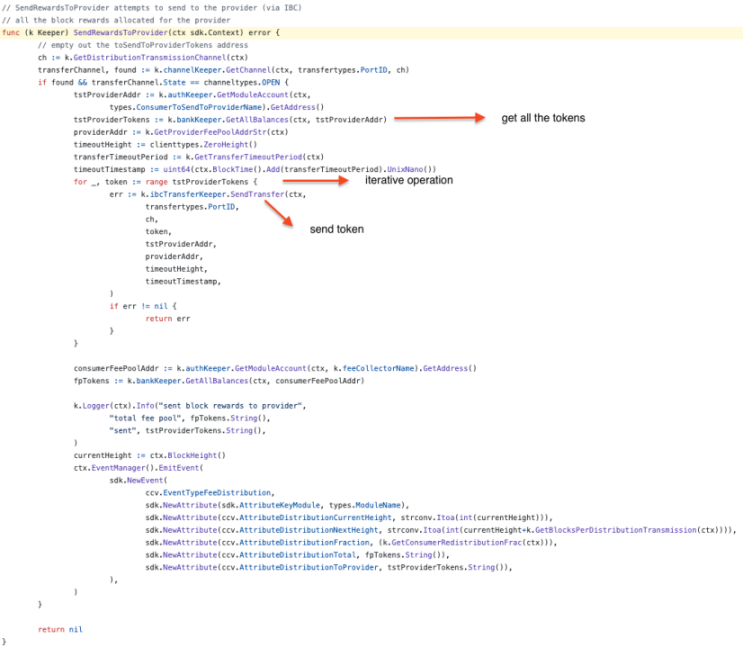 漏洞位置:https://github.com/cosmos/interchain-security/blob/6a856d183cd6fc6f24e856e0080989ab53752102/x/ccv/consumer/keeper/distribution.go#L103