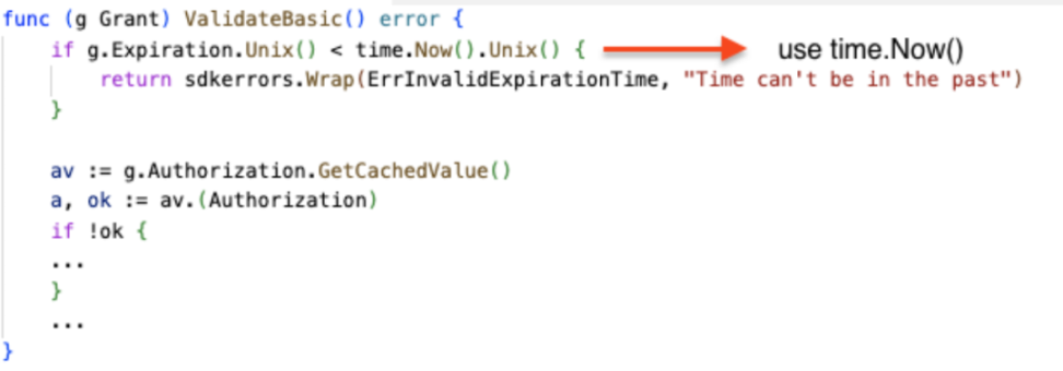 Cosmos SDK 的 x/authz 模块中 ValidateBasic 方法的非确定性行为容易导致共识停止。x/authz 模块的 MsgGrant 消息结构包含一个 Grant 字段,其中包括用户定义的授权所授予的到期时间。在 Grant 结构的 ValidateBasic() 验证处理中,比较其时间信息与节点本地的时间信息而不是区块时间信息,由于本地时间是非确定性的,各个节点的时间戳可能存在差异,因此会导致共识问题。
