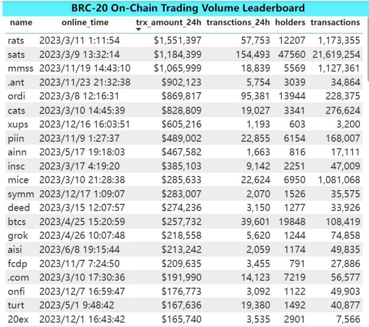 rats(Token):BRC20 赛道代币出现普遍回调,但 rats 依然在现货市场上有不错的交易量,近 24 小时交易量约 155 万美金。