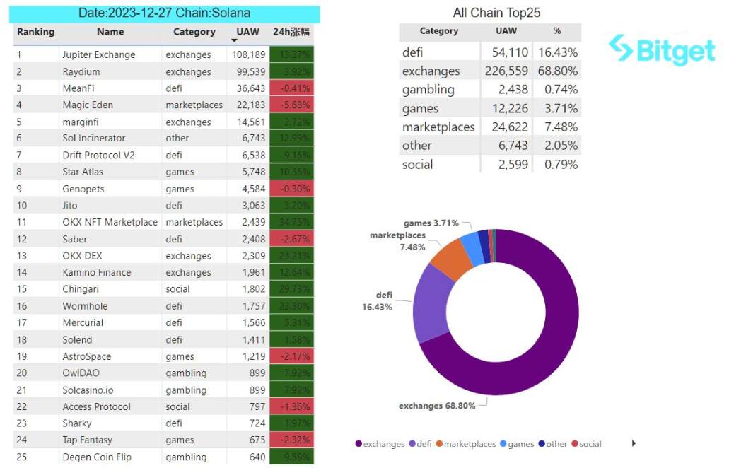 Jupiter Exchange(Dapp):Solana 生态交易衍生品交易所 Jupiter Exchange 已公布 JUP 社区空投的详细信息,其中 JUP 总量 100 亿枚,40% 将通过 4 轮空投分配给社区,本轮将分配 10%(10 亿枚),后续还会有针对新用户的空投。近期受 Solana 链上交易量大幅增长甚至超越 ETH,热度提升,未来可以持续关注。