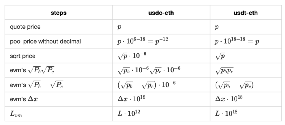 对于 evm 中,我们需要做一些代换,现实中的价格是有 decimal,需要转换成 evm 中无单位价格,其中 usdc,usdt,eth 的 decimal 分别为 6,18,18.