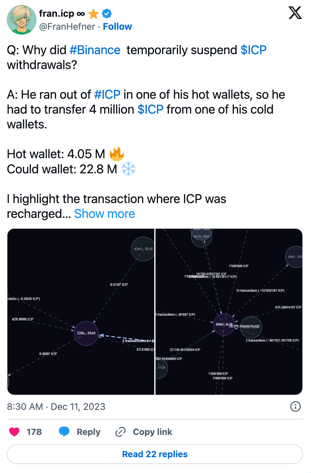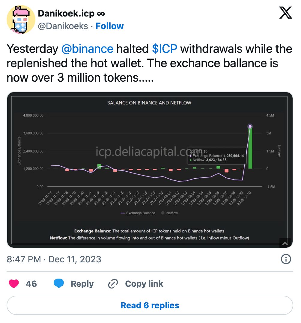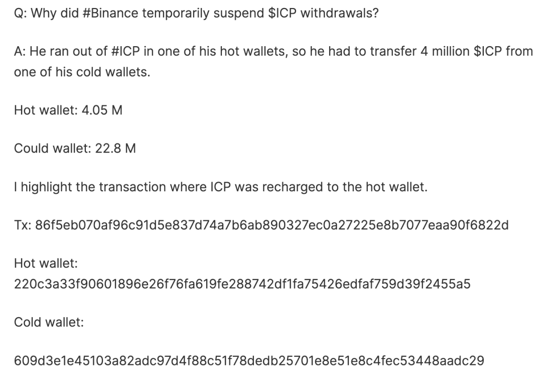 2023 年 12 月 10 日,币安暂停了 ICP 的提币,因为它的 ICP 热钱包被提空了,现在,币安的热钱包 ICP 余额还在极速减少。