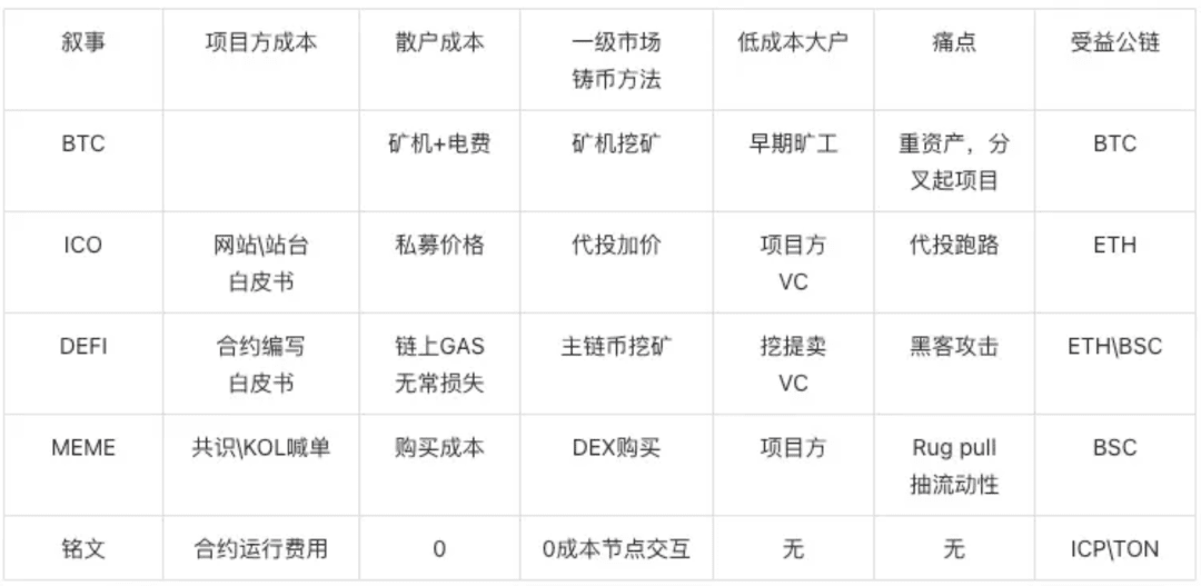 过去几轮牛市,币圈这个自由市场,伟大创新也好,庞氏骗局也好,引爆牛市的玩儿法,始终在朝着项目方起盘子效率更高成本更低、散户获得筹码摩擦成本更低、中间无需信任、筹码流动和坐庄更透明、博弈更自由、去 VC 化这个方向在走,见下表: