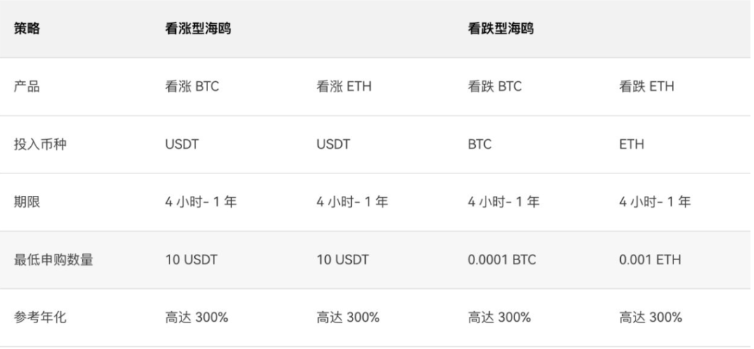 海鸥是 OKX 12 月上线的最新结构化理财产品,目前使用海鸥赚取收益的用户超 1500 人。是 OKX 结构化理财矩阵中的一员,本质仍然是简单期权,主要分为看涨海鸥和看跌海鸥两个方向,看涨海鸥支持用户投入 USDT,看跌海鸥支持用户投入 BTC 和 ETH。仅上线不到一个月,用户申购金额已达 356 million。