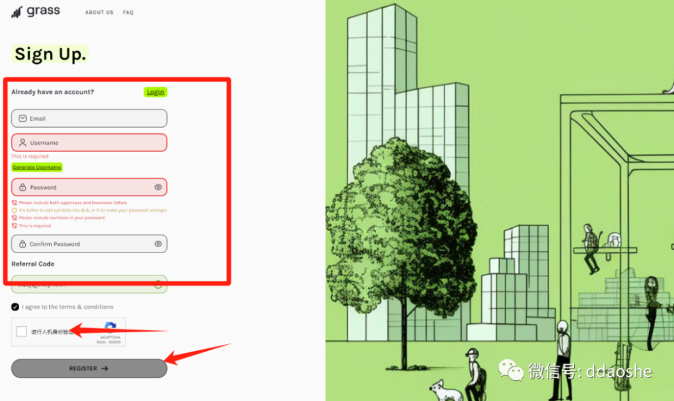 关于空投:其实,在 2 个月前都关注到这个项目,因涉及到网络共享的原因,只在群里提过,未出相关教程,但是现在已明确获得融资,且 depin 概念火热,再次提一下。目前共享网络可获得积分,后续将作为空投凭证,但毕竟该项目需要共享个人网络,在网络传输过程中,传输数据无法被用户实时审查,作为一个国外产品,国内用户在使用过程中,不可避免的面临一定的风险,请自行评估其中风险。https://app.getgrass.io/register/?referralCode=tkzsjqjvNvyFhXA按照要求填写基本信息,人机验证后,点击 register