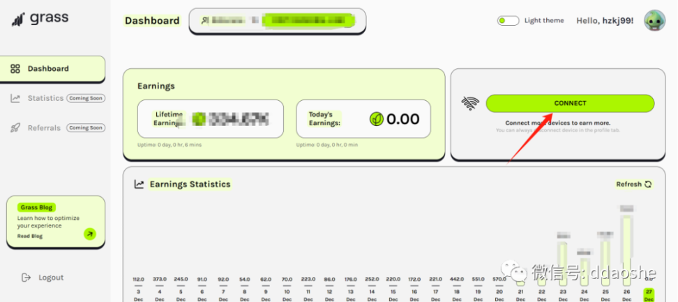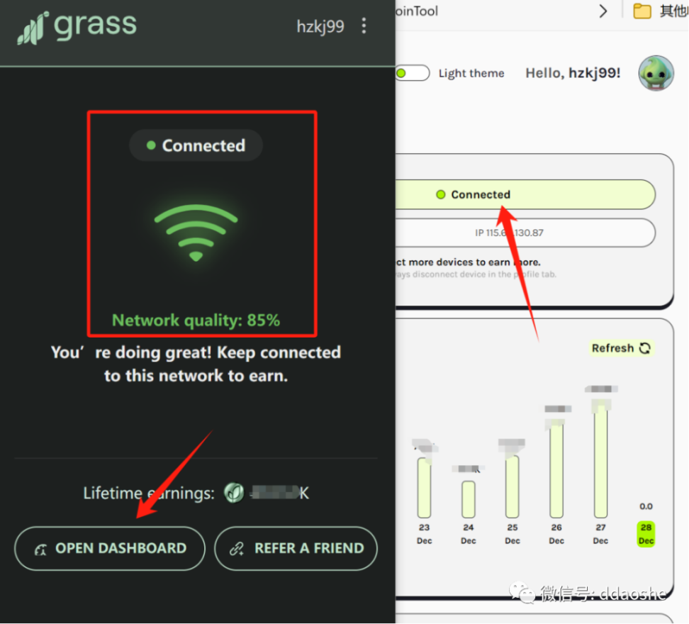 5 等待完成链接网络,点击 opendashbord,进入自己控制面板可以看到自己的链接状态,挂机进行贡献宽带即可(挂机过程中,尽量把魔法工具关闭,以免影响网络链接),在控制面板页面可以看到自己每天挂机积分收入,以及网络状态