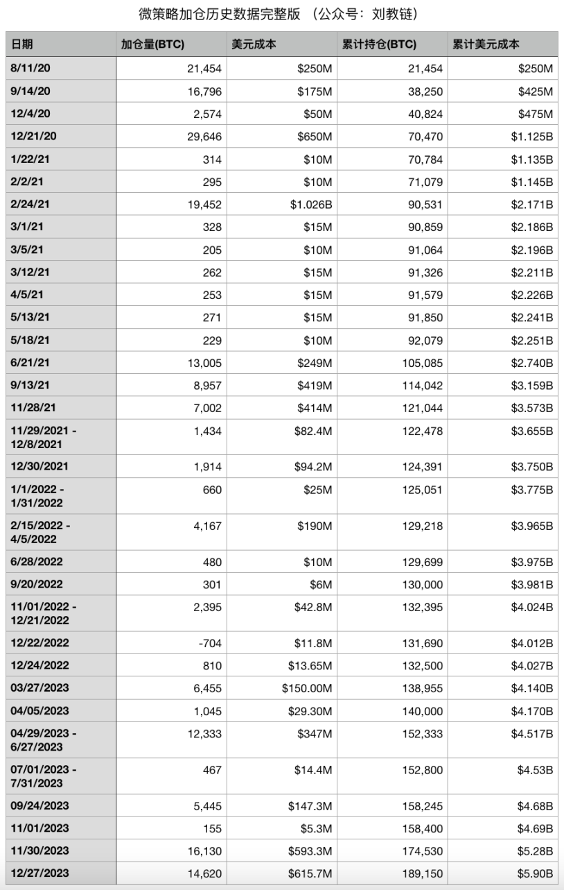 教链整理了一下微策略自 2020 年 8 月初至 2023 年 12 月底全部加仓历史数据如下: