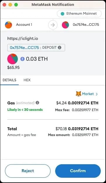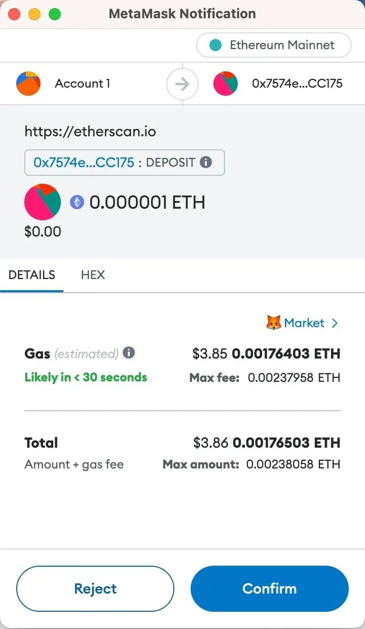 您将被要求签署并支付交易的 Gas 费,请确保 ETH 金额正确。