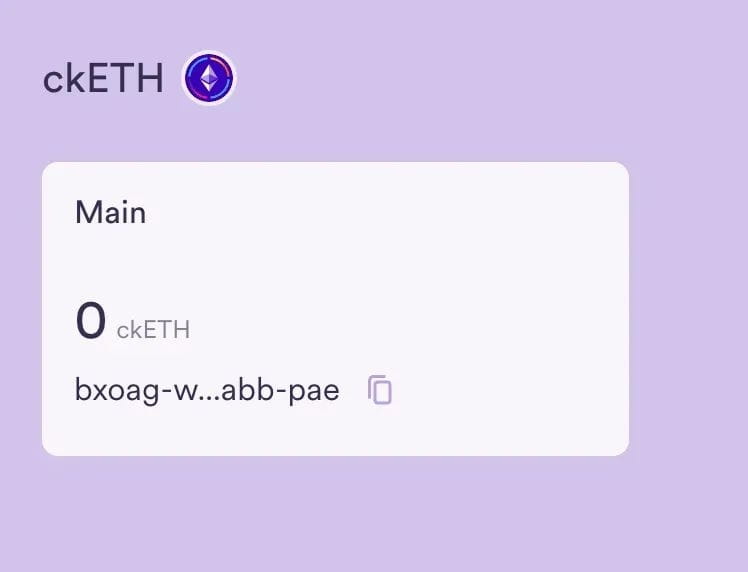 在我的代币下,选择 ckETH,在主要部分中,复制显示的主体 ID(字母组合,右侧有复制按钮)。