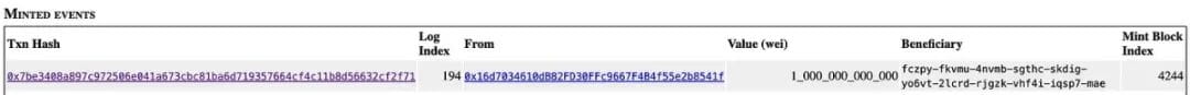 铸造事件将显示 WEI 中的 ETH 金额(ETH 金额 * 10^18)、交易哈希和您的 ICP 主体。