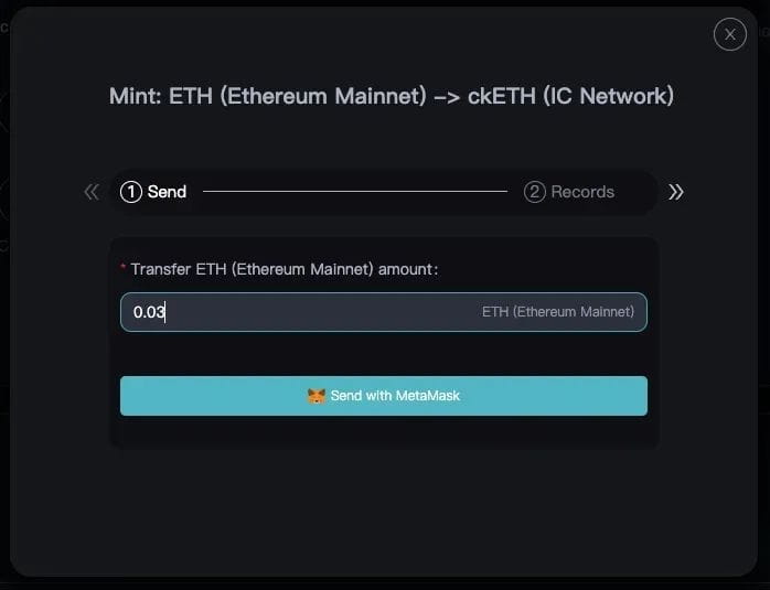 下一个屏幕将要求您输入您想要转移以换取 ckETH 的 ETH 数量,输入 ETH 金额(至少 0.03 ETH),然后单击“使用 MetaMask 发送”。