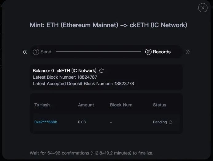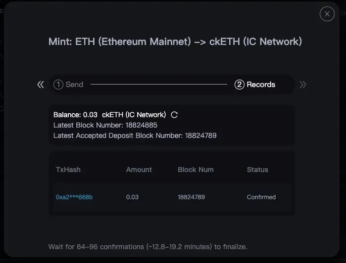 您可以在 ICP 上查看 ckETH Minter Dashboard,一旦以太坊交易成功且区块被确认,ckETH 就发送给您。