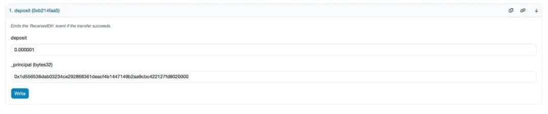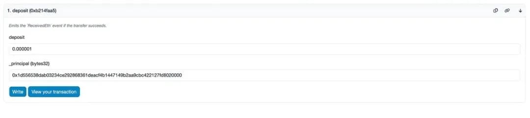 您必须使用以太坊 0x7574eB42cA208A4f6960ECCAfDF186D627dCC175 上的 ckETH 辅助合约中的存款功能存入 ETH,并指定在步骤 1 中创建的 32 字节 ICP 主体或钱包地址来接收 ckETH。
