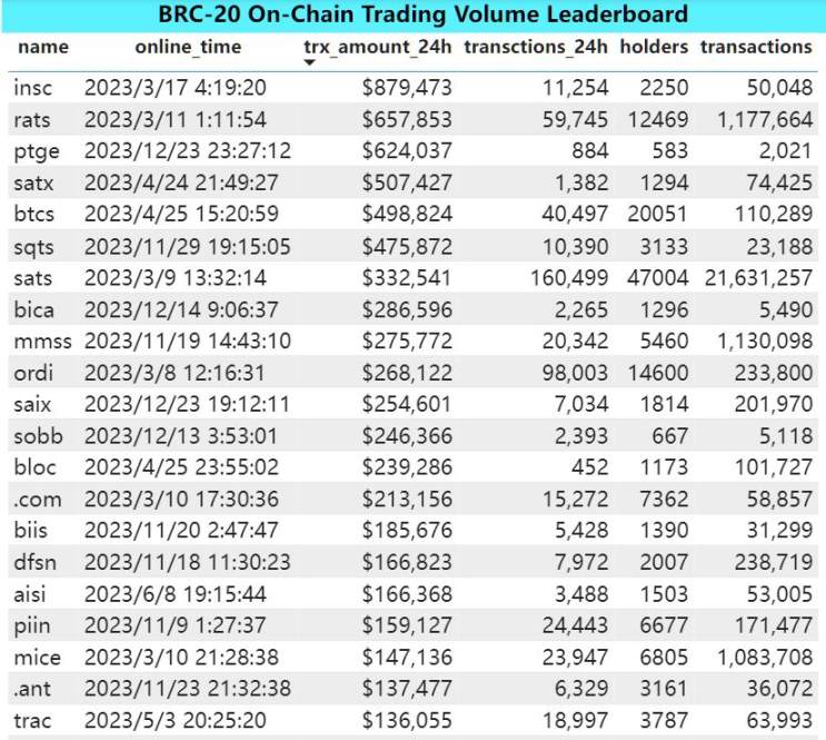 INSC(Token):BRC20 代币,代表铭文 inscriptions,2023 年 3 月 17 日部署,在 SATS 之后被部分社区用户挖掘以类比在 BRC20 赛道中有一定 meme 地位。目前代币市值 1500 万美金,24 小时链上交易量 88 万,持有地址数 2250,还处于较少阶段。