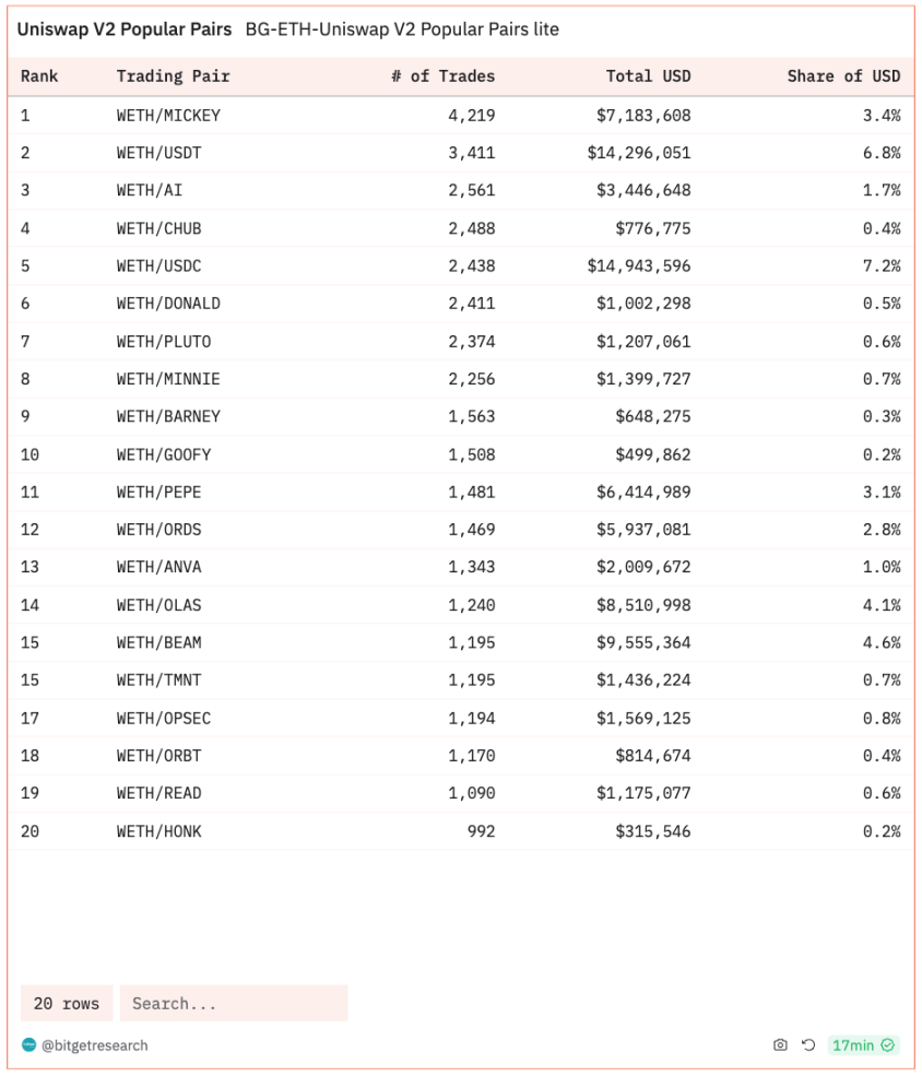 MICKEY(Token):迪士尼经典形象米老鼠为核心意向的 meme 币,受从今年 1 月 1 日起迪士尼公司不再拥有初版米老鼠版权,链上出现多个米老鼠 meme 币,最终 MICKEY 获得资金共识,市值突破 1000 万美金,24 小时交易量 625 万美金。