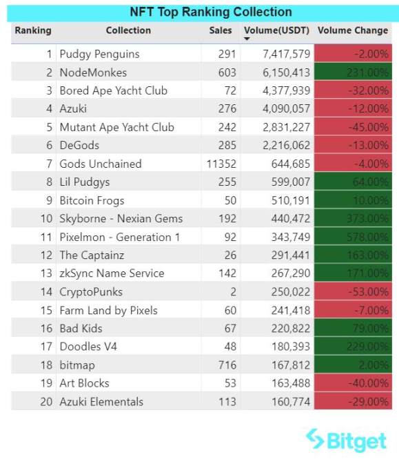 NodeMonkes(NFT):Ordinals NFT 项目,以代码猴为 meme 属性,最新地板价达到 0.249 BTC,超越 Bitcoin Frogs 成为目前 Ordinal NFT 市场最热门的 NFT 项目,市值突破 1 亿美金,在 Magic Eden 上 24 小时交易量超 600 万美金。