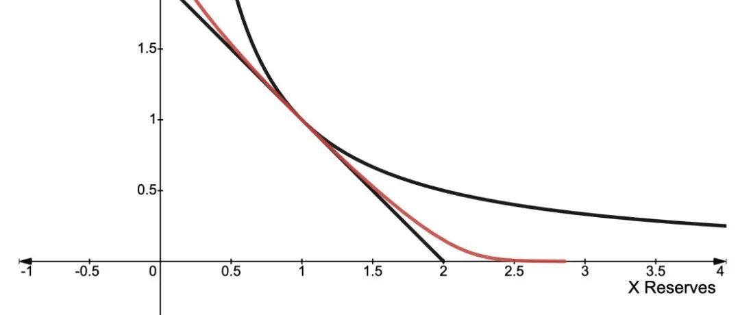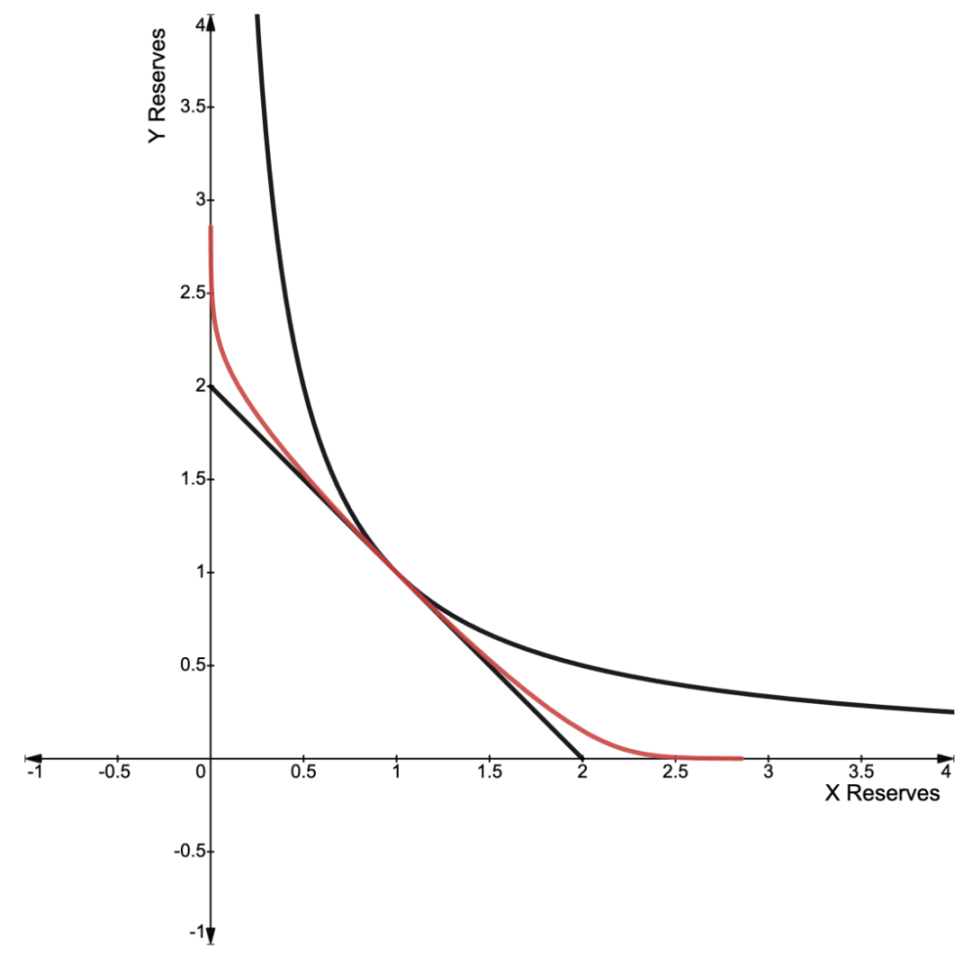 这个方程以一种有趣的方式将 CSMM 和 CPMM 方程结合在一起,类似于 StableSwap(Michael Egorov. “Stableswap-efficient mechanism for stablecoin liquidity[1]”. In: (2019).)。当 c = 0 时,我们得到一个纯 CPMM 方程,当 c 增大时,它趋向于一个纯 CSMM 方程。