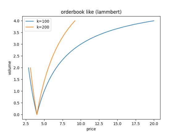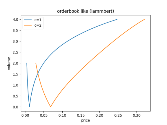 我们绘制了使用常积曲线(uni v2 使用)与 LAMMbert 曲线模拟的订单簿情况: