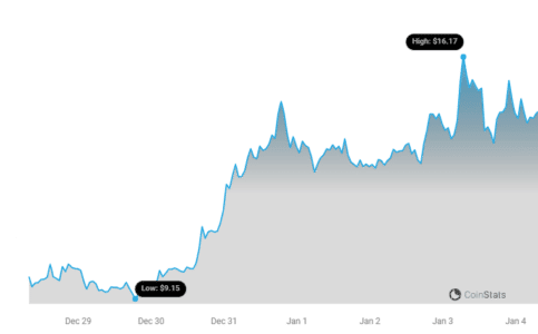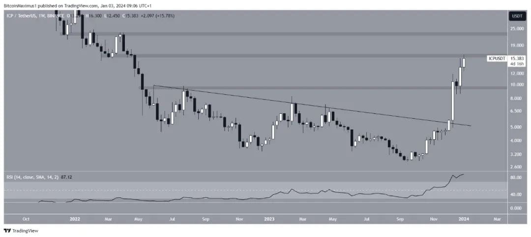 互联网计算机协议(ICP)价格在过去 4 周内迅速上涨,今天最高达到 16.30 美元,自 2023 年 10 月以来的上涨走势完全呈抛物线形,导致突破关键阻力位。