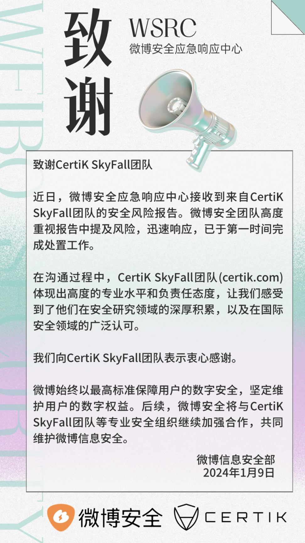 近日,CertiK SkyFall 团队向微博安全应急响应中心发出安全风险报告。微博安全团队高度重视报告中提及风险,迅速响应,已于第一时间完成处置工作,并向 CertiK SkyFall 团队发出致谢。