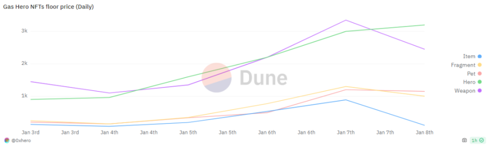 在上一周,StepN 团队研发的新链游 Gas Hero 开启了不删档公测,‘三天回本’的财富效应在社区中弥漫,吸引了社群众多玩家的加入,而 Gas Hero 在社区的 Fomo 中也不负众望,几乎游戏内所有的资产都出现了持续上涨的势态,其中英雄角色类 NFT 资产在 5 日内的涨幅 375%,宠物类 NFT 资产 5 日涨幅 475%,碎片类 NFT 资产涨幅 456% 等等,基本所有 NFT 资产都有 4 倍左右的增长。