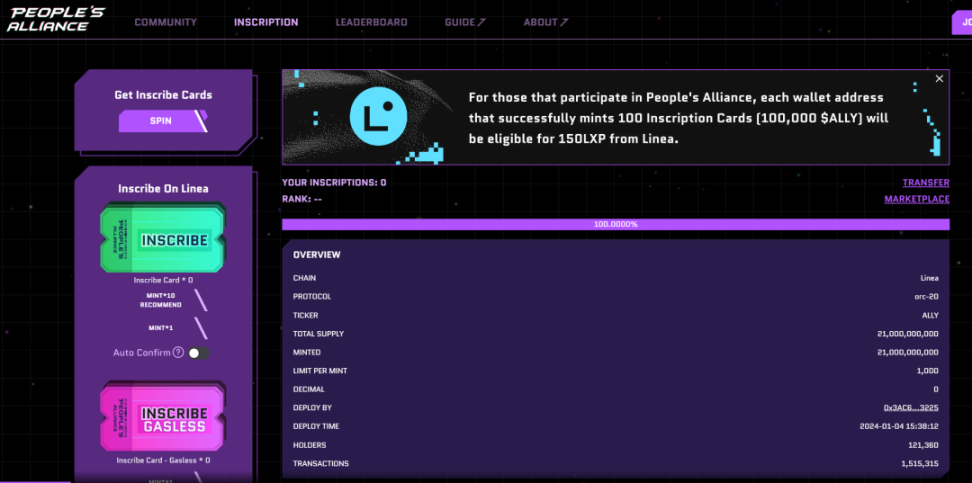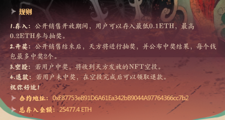 那么相较于铭文赛道的冷清,NFT 市场在上周出现的几个明星项目表现就有点骇人了,链游板块的 Gas Hero、Lumi Terra 就不提了,我们主要关注国产 PFP 项目 Tinfun 天方。天方成为了 2024 年开年以来第一个现象级的 NFT 项目,其在上周周末开启了 NFT 预售活动后,市场表现出来的热度令人震惊,仅仅一天的时间,天方的公售池子就已经收获了 25477 枚以太坊,总价值已经超过了 4 亿人民币,震惊了整个市场,要知道参与抽奖的规则是每个地址只能存入 0.2 个以太坊,也就是说目前已经有将近 13 万个地址参与了本次预售活动,天方的项目方要是格局低一些,让 NFT 市场的黑天鹅事件再次发生,这 4 亿人民币也足够项目方跑路后实现人生自由了。